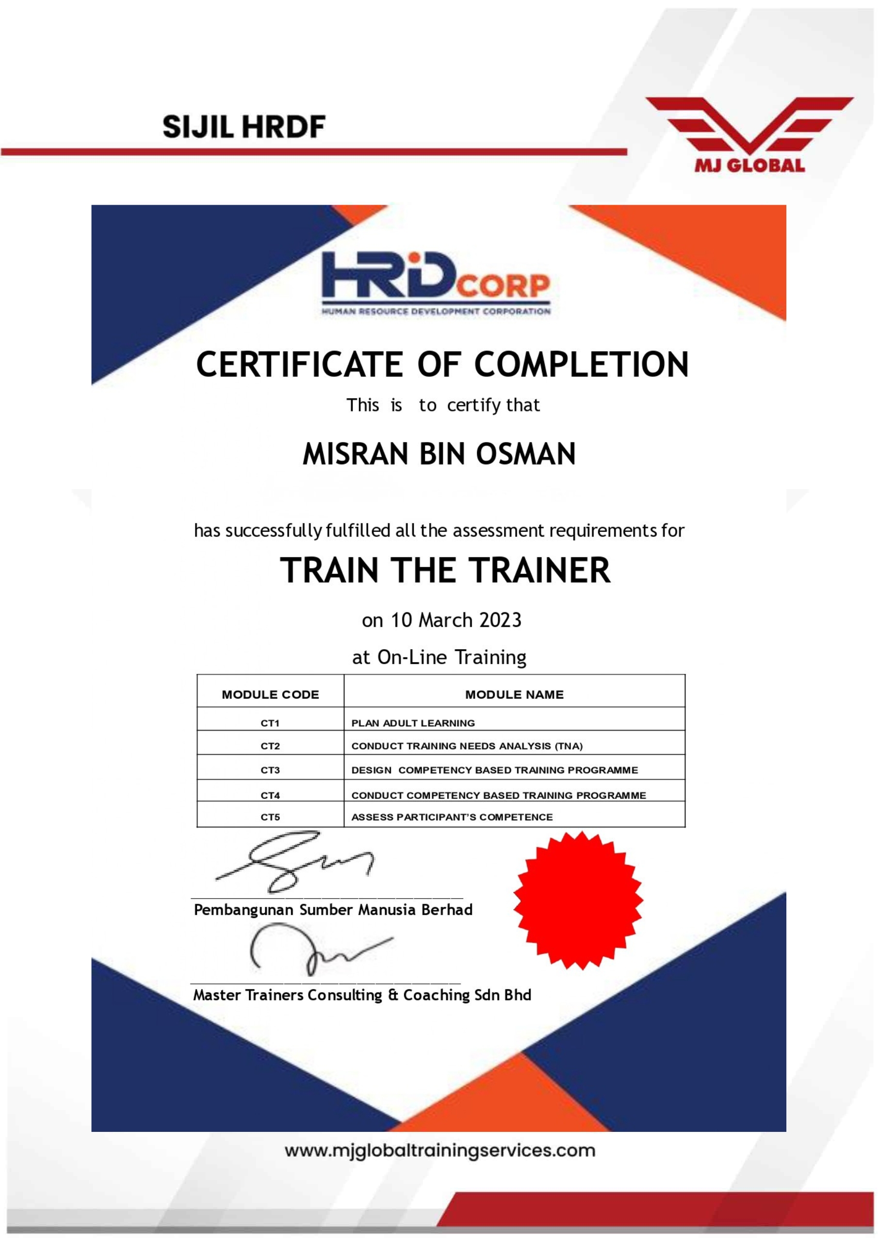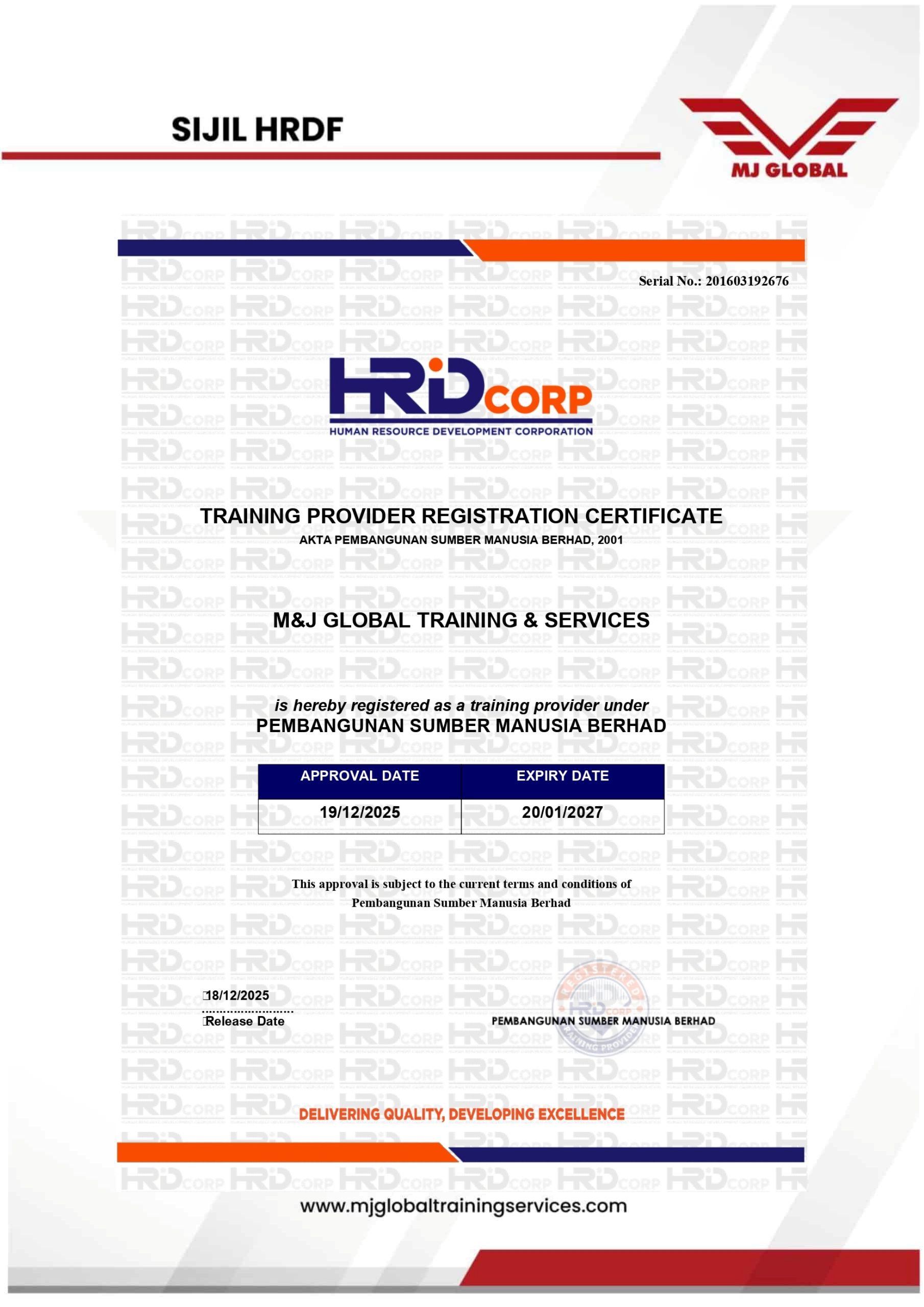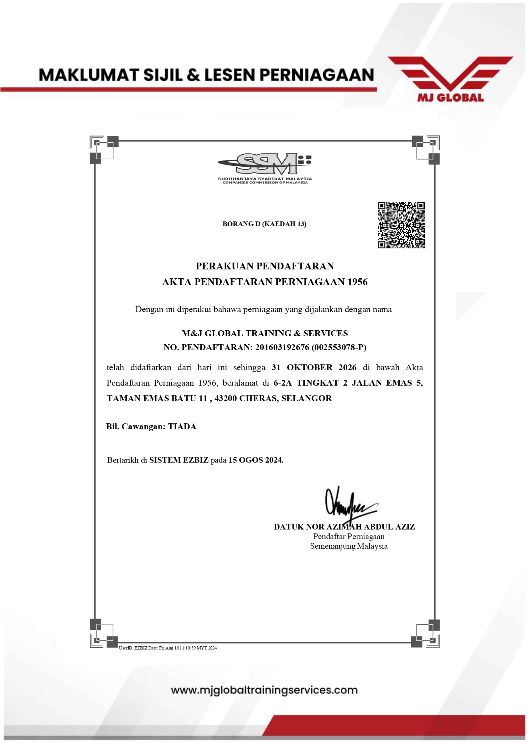 M&J GLOBAL TRAINING & SERVICES SDN BHD is a Bumiputera-owned sole proprietorship registered with the Ministry of Finance Malaysia (MOF), the Companies Commission of Malaysia (SSM), and the Human Resources Development Fund (HRDF). They also hold Category C under the National Training Licensing Scheme of the National Sports Council.